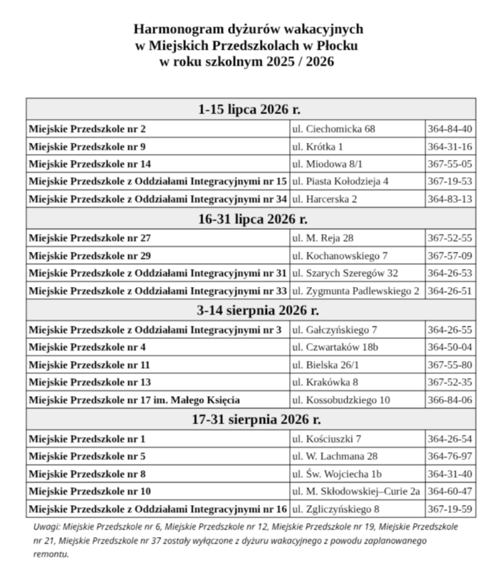 Harmonogram dyżurów wakacyjnych w Miejskich Przedszkolach w Płocku w roku szkolnym 2025/2026