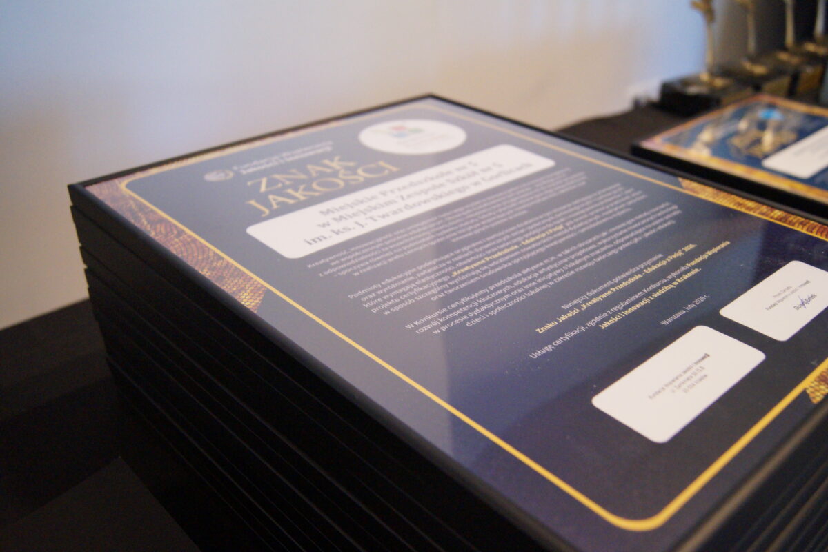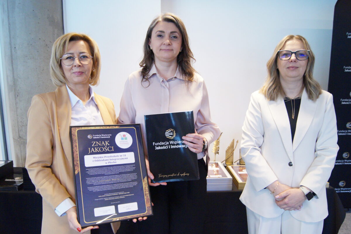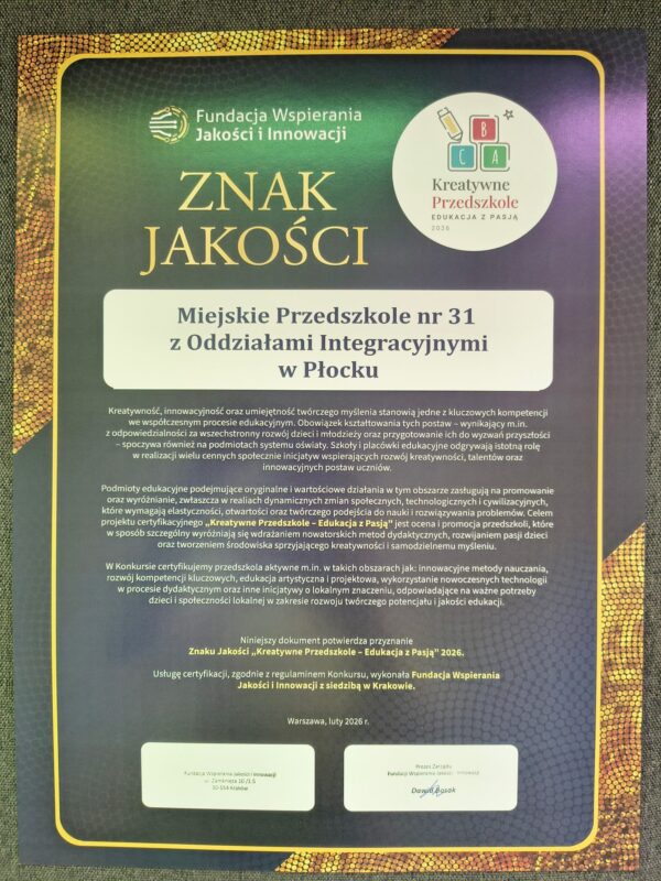 Nasze przedszkole może poszczycić się kolejnym wyjątkowym wyróżnieniem. Fundacja Wspierania Jakości i Innowacji z siedzibą w Krakowie przyznała nam zaszczytny tytuł: „Kreatywne Przedszkole- Edukacja z Pasją”. Nagrodą otrzymaliśmy za szereg podejmowanych działań w obszarze współpracy ze środowiskiem lokalnym i na rzecz lokalnych instytucji, rozwijanie u dzieci kreatywności, pomysłowości, rozbudzanie ciekawości świata i wykraczanie poza schematy poprzez opracowywane i realizowane innowacje pedagogiczne oraz liczne programy własne wspierające wszechstronny rozwój naszych wychowanków.