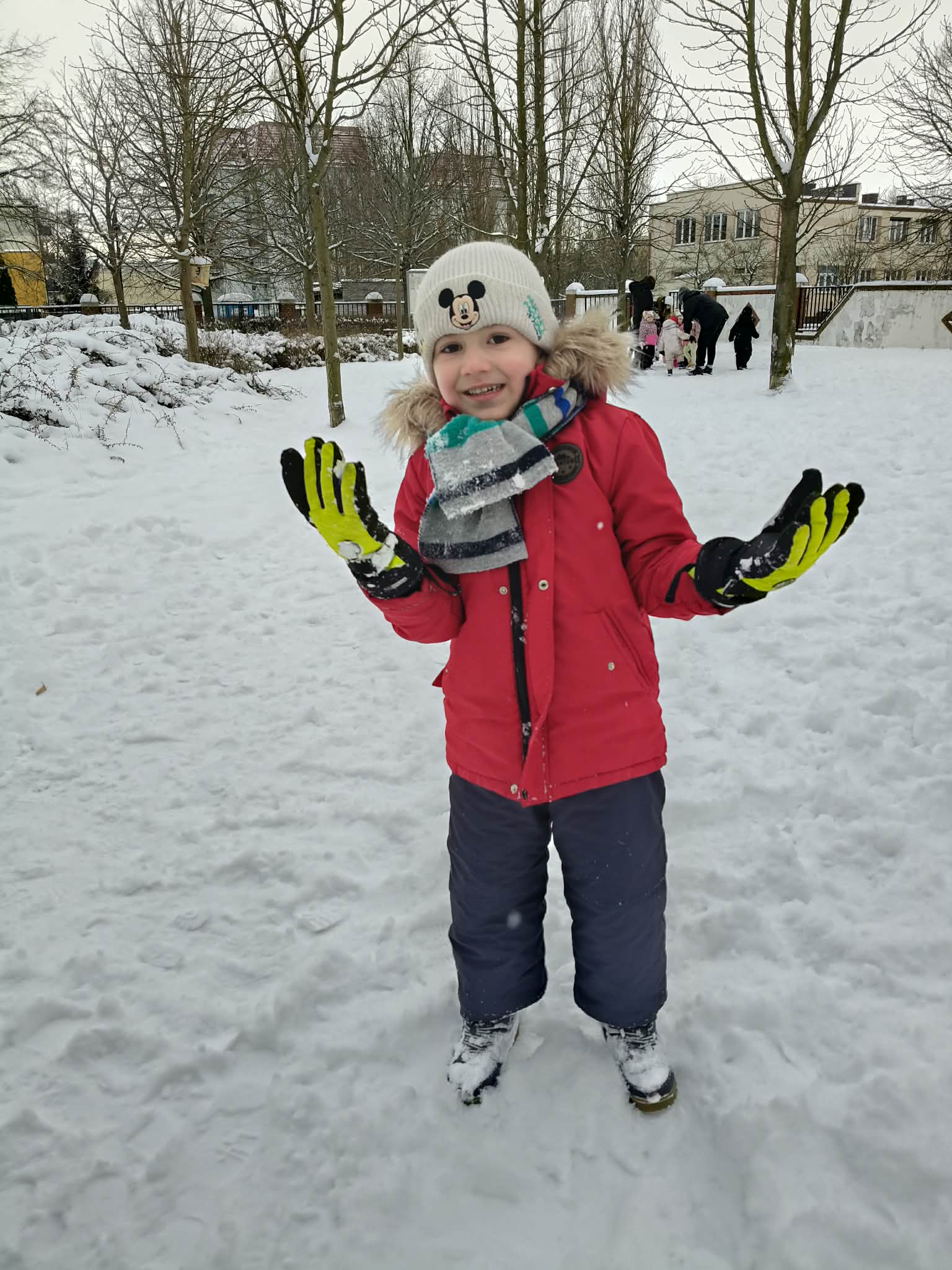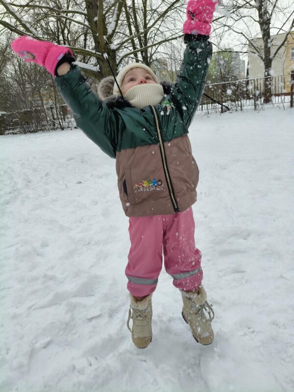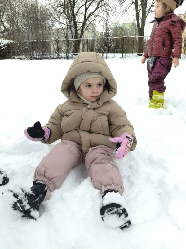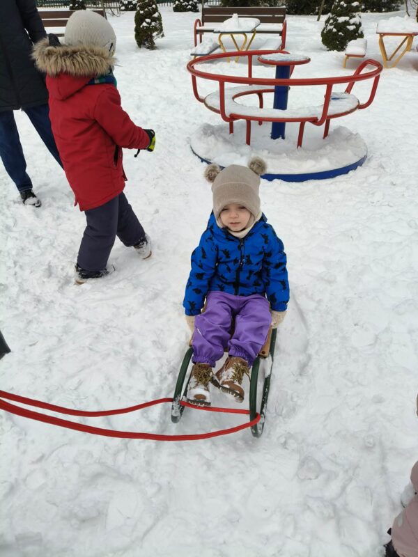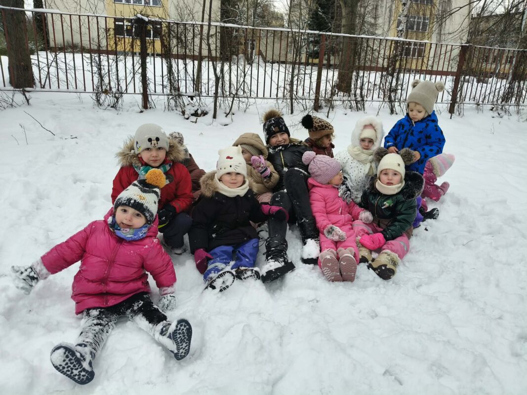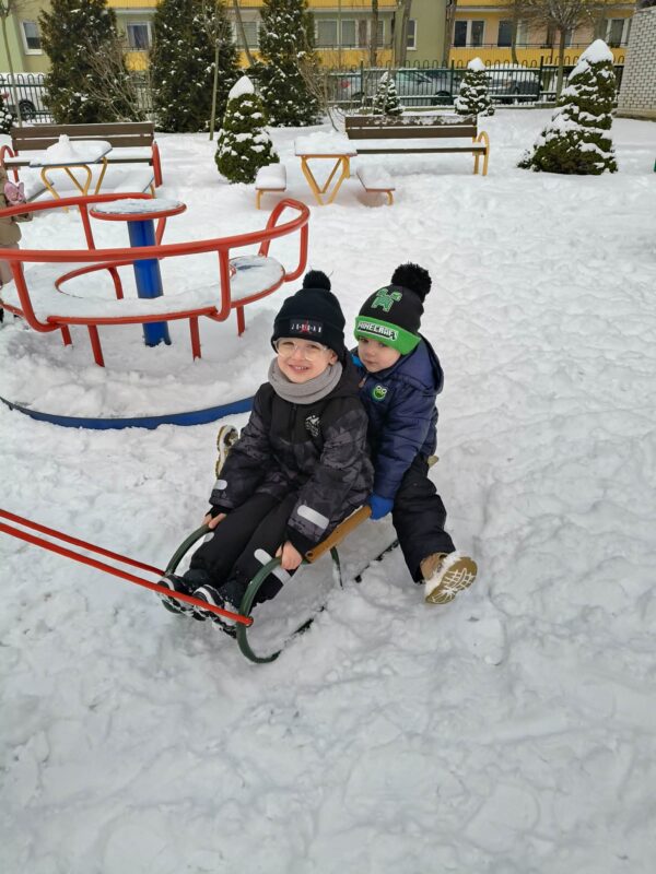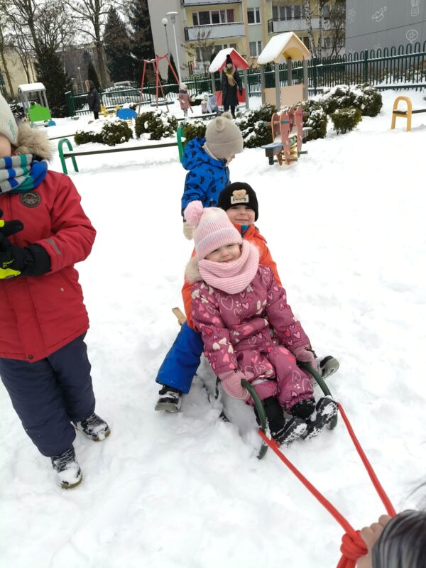 Korzystając z uroków zimy przedszkolaki bawiły się na śniegu w naszym przedszkolnym ogrodzie i pobliskim parku. Dzieci oddały się zimowemu szaleństwu rzucając śnieżkami, jeżdżąc na sankach, czy robiąc aniołki na śniegu. Dzieci uwielbiają zabawy na świeżym powietrzu, była to dla nich to świetna rozrywka. Było wesoło i radośnie. Z uśmiechami na twarzach wróciliśmy do przedszkola na ciepły obiad.