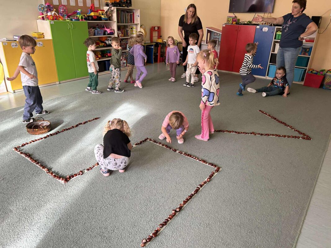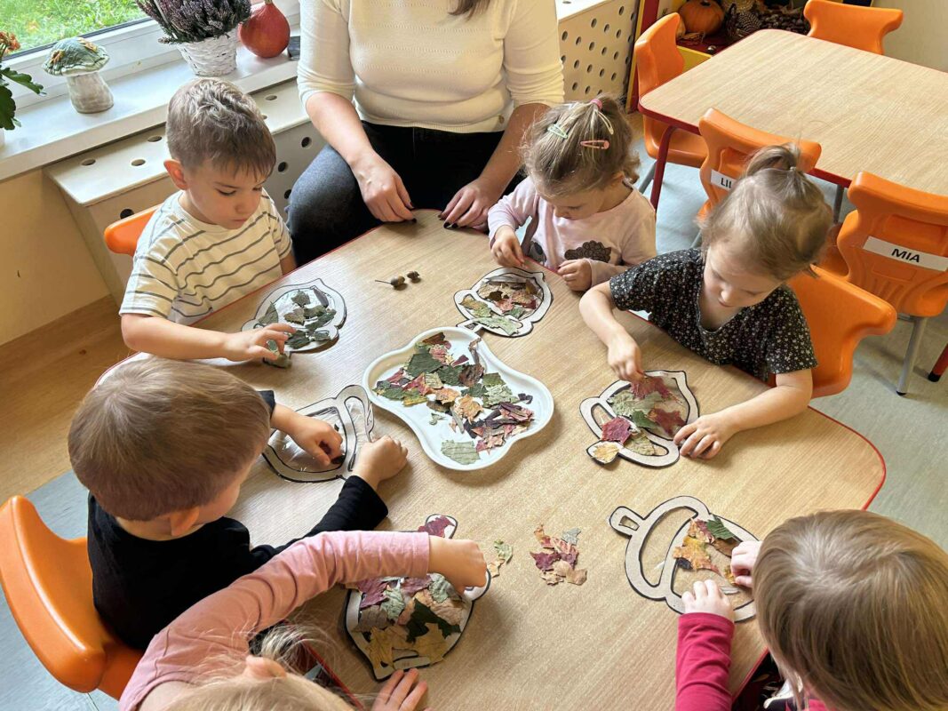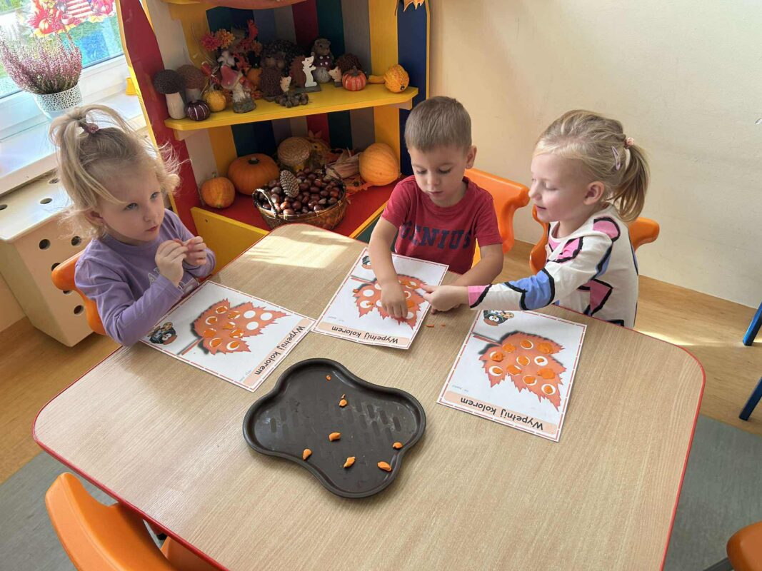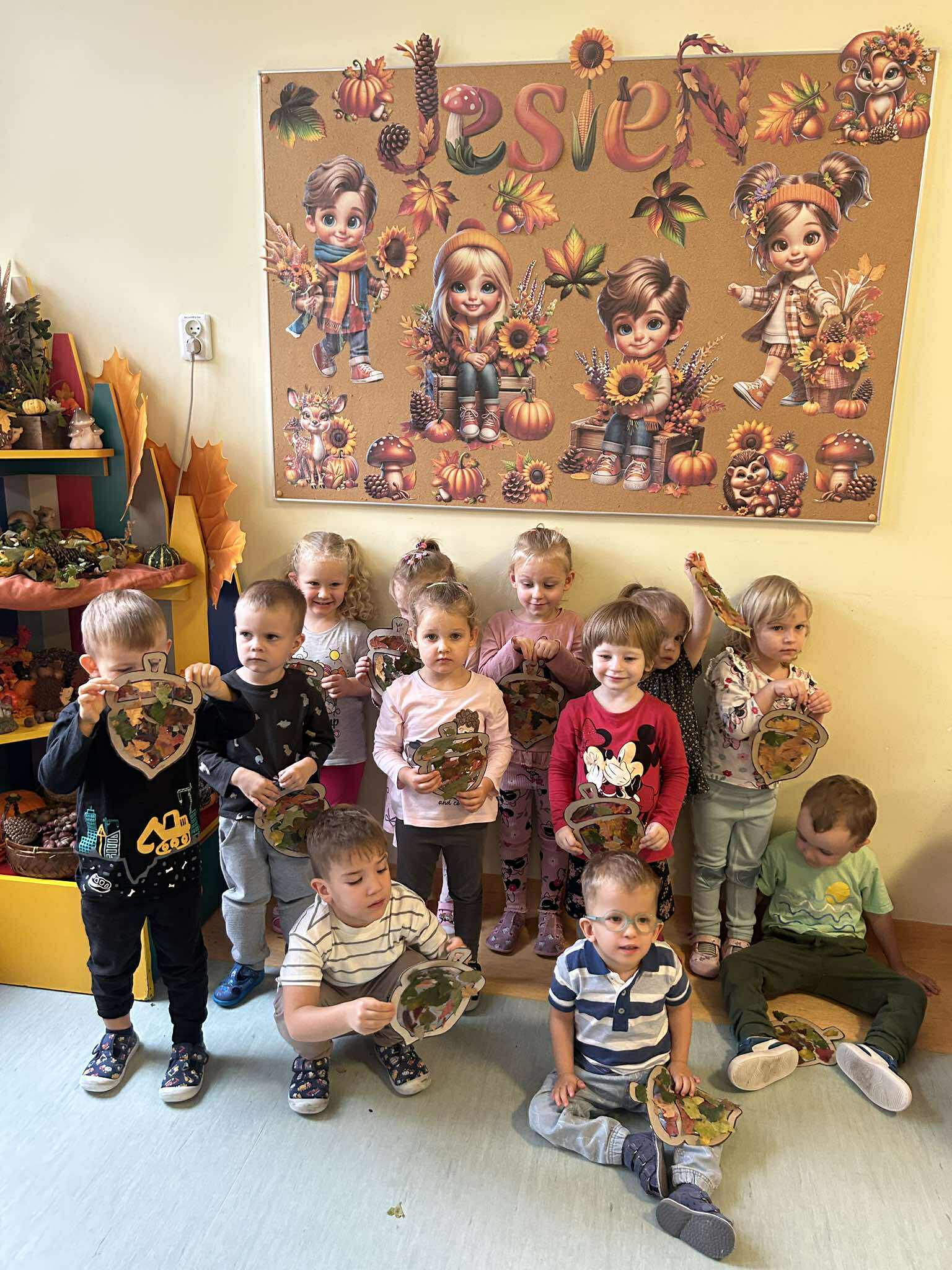 W miesiącu październiku obserwowaliśmy zmiany zachodzące w przyrodzie jesienią. Szczególnie podczas naszych spacerów do Parku Północnego. Dzieci przynosiły także do naszego kącika przyrodniczego w sali przedszkolnej różne dary jesieni: liście, kasztany, żołędzie, jarzębinę. Wykorzystywaliśmy je później do naszych prac plastycznych oraz zabaw matematycznych.