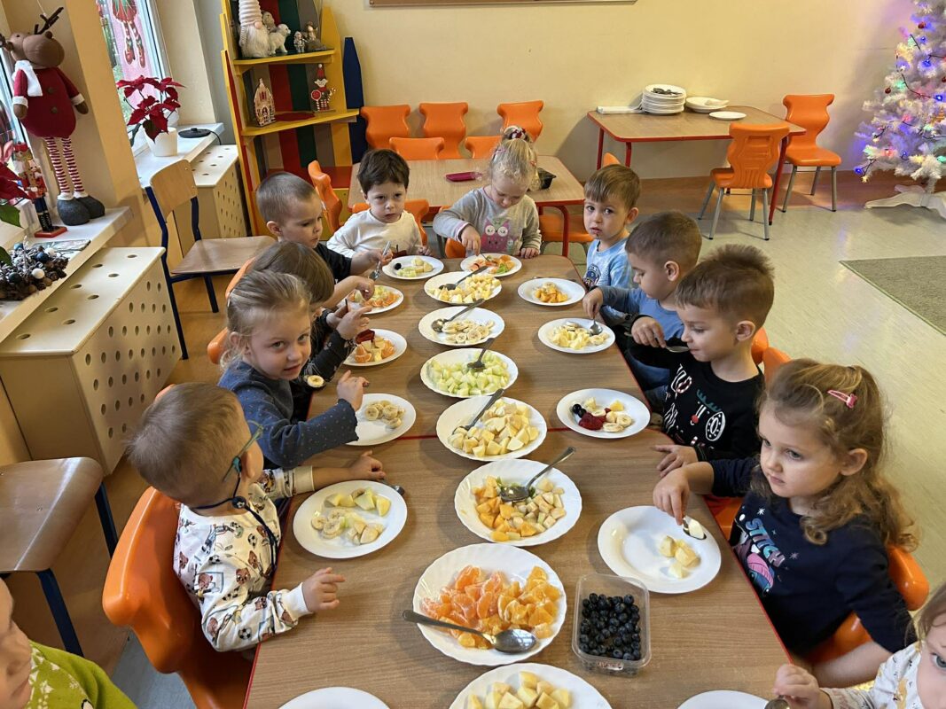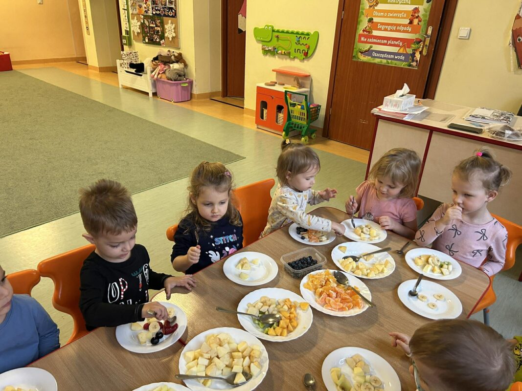 W ramach realizowanej innowacji ,, Akademia zdrowia i uśmiechu” dzieci z naszej grupy uczestniczyły w warsztatach kulinarnych. Poznały za pomocą zmysłu smaku, węchu i dotyku różne owoce. Każde dziecko wybierało swoje ulubione pokrojone owoce i tworzyło na swoim talerzu sałatkę. Następnie ją próbowało. Mamy nadzieję, że dzieci będą pamiętały o tym, aby jeść owoce.