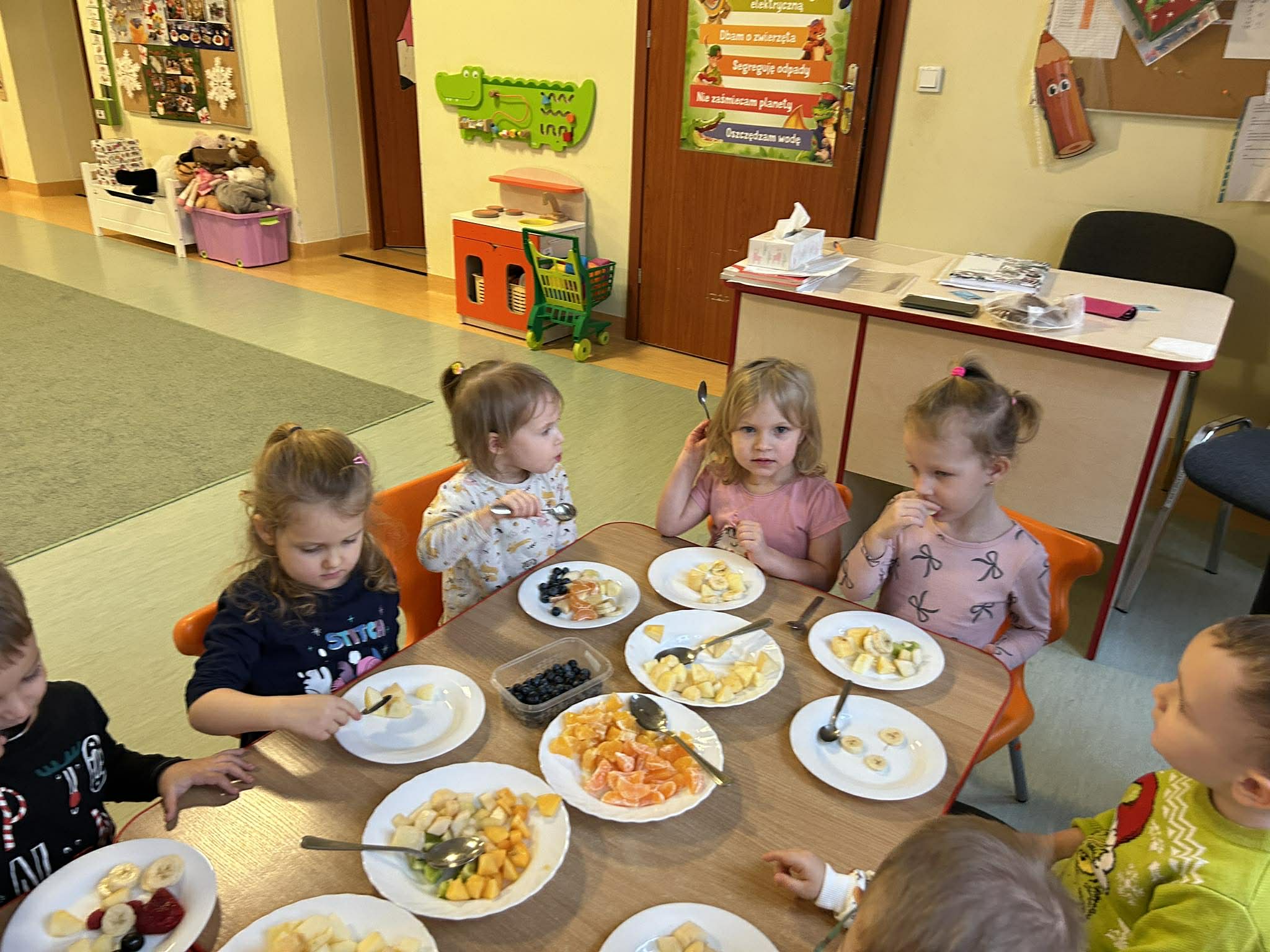 W ramach realizowanej innowacji ,, Akademia zdrowia i uśmiechu” dzieci z naszej grupy uczestniczyły w warsztatach kulinarnych. Poznały za pomocą zmysłu smaku, węchu i dotyku różne owoce. Każde dziecko wybierało swoje ulubione pokrojone owoce i tworzyło na swoim talerzu sałatkę. Następnie ją próbowało. Mamy nadzieję, że dzieci będą pamiętały o tym, aby jeść owoce.