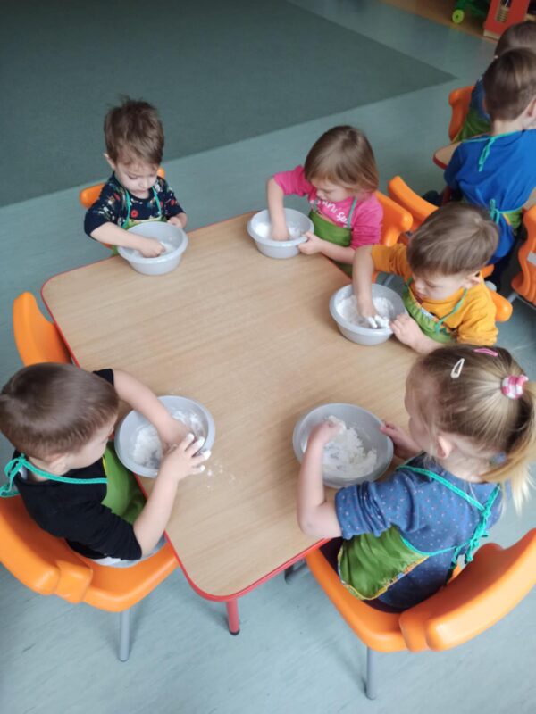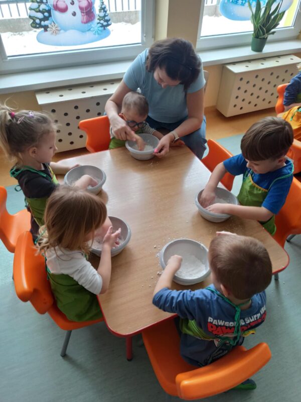 Mnóstwo śniegu dookoła, więc grupa maluszków postanowiła przeprowadzić zabawę badawczą. Wykorzystały do tego mąkę ziemniaczaną i olej. Okazało się, że powstała masa wygląda jak śnieg. Jest biała, skrzypi i można ją ugniatać, robiąc kule śniegowe oraz bałwanka. Dzieci miały przy tym mnóstwo radości i uśmiechu.