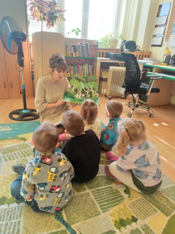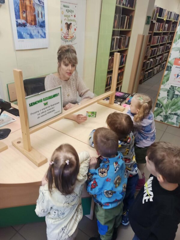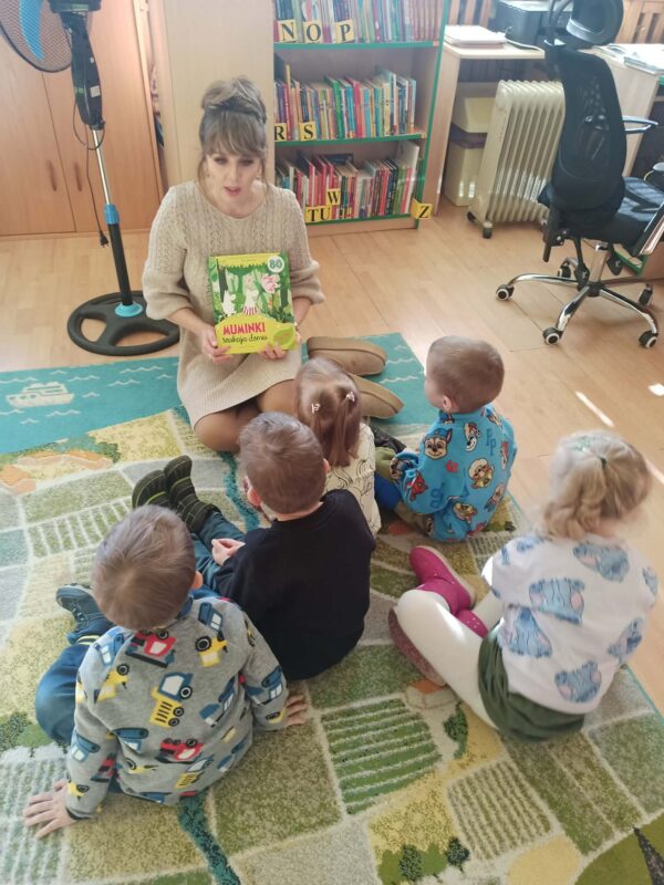Ze względu na realizowaną tematykę o bajkach wybraliśmy się do pobliskiej biblioteki. Była to nasza pierwsza wizyta, podczas której dzieci dowiedziały się, co można robić w bibliotece. Pani przeczytała nam książeczkę o przygodzie Muminków, oprowadziła nas po bibliotece i wytłumaczyła, jak wypożycza się książki. Z pewnością jeszcze tam wrócimy.