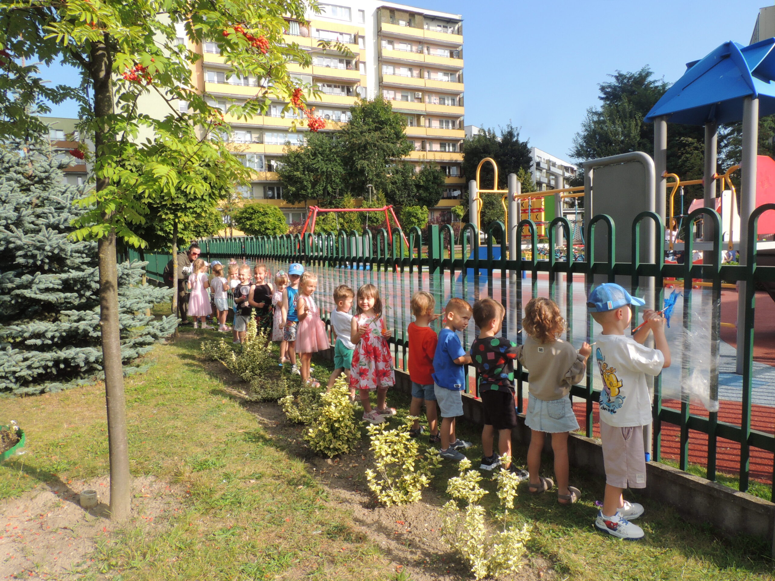 Korzystając z pięknej pogody dzieci miały możliwość zdobyć nowe doświadczenie podczas wspólnego malowania farbami na folii umieszczonej w przedszkolnym ogrodzie. Malowanie okazało się świetną zabawą pobudzającą wszystkie zmysły dzieci. Zajęcia w plenerze dostarczyły wielu pozytywnych emocji, a także sprawiły, że teren przedszkola zamienił się tego dnia w jedno wielkie dzieło sztuki.