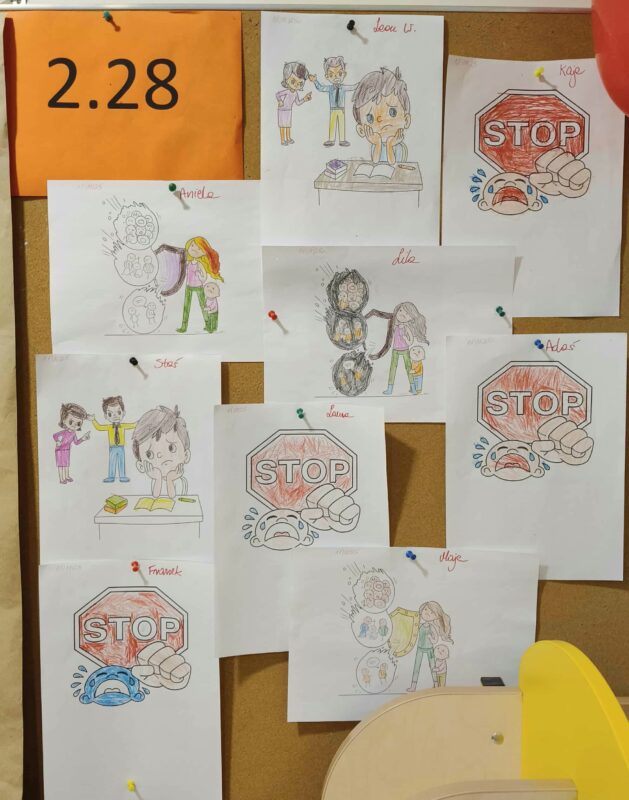 19 listopada grupa V włączyła się w kampanię Międzynarodowego Dnia Przeciwdziałania Przemocy wobec Dzieci. Tego dnia dzieci przyszły ubrane na czerwono. Rozmawiały o bezpieczeństwie, szacunku i trosce, a także wspólnie stworzyły plakat. Była to doskonała okazja, aby uwrażliwiać najmłodszych na znaczenie życzliwości i wsparcia oraz przypomnieć, że każde dziecko zasługuje na miłość, zrozumienie i bezpieczne środowisko do rozwoju.