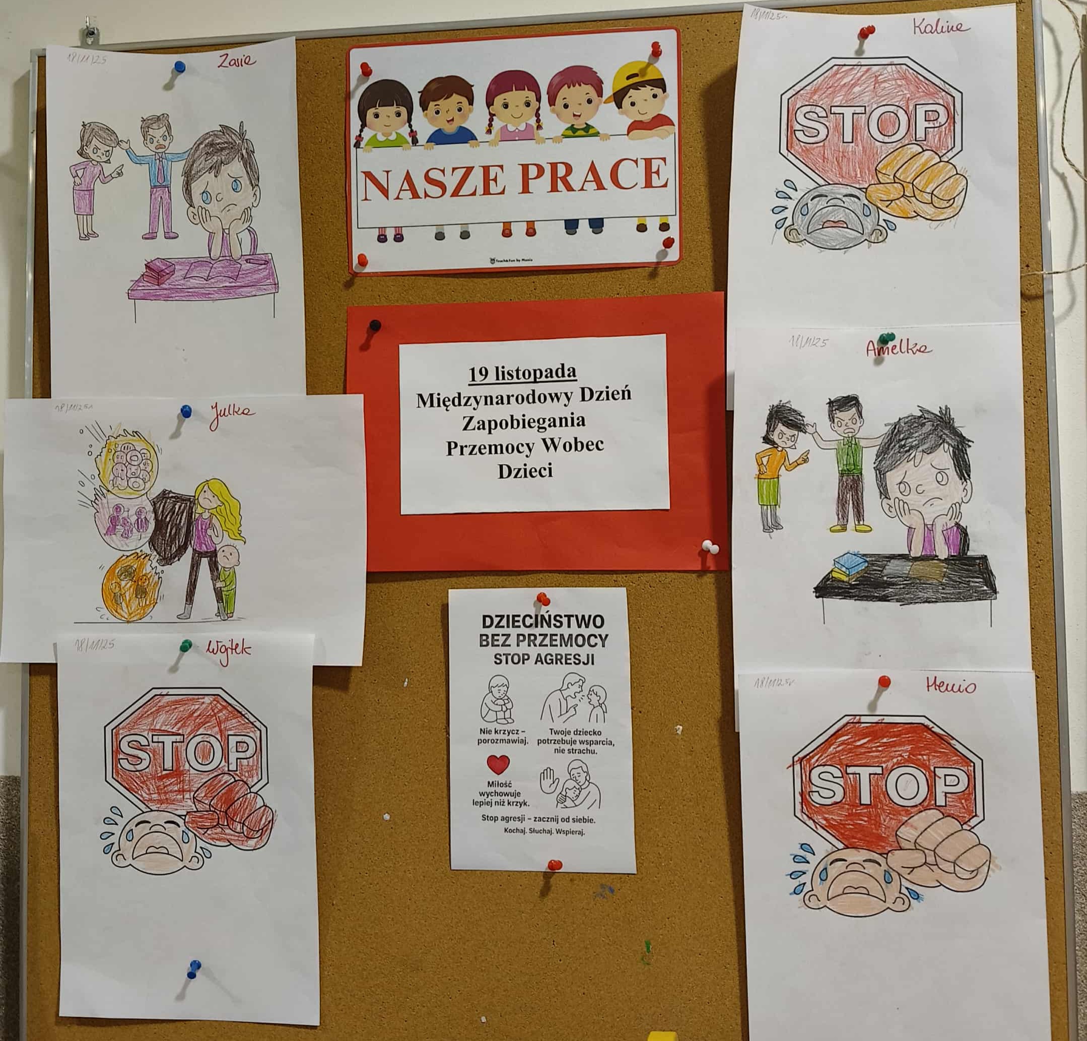 19 listopada grupa V włączyła się w kampanię Międzynarodowego Dnia Przeciwdziałania Przemocy wobec Dzieci. Tego dnia dzieci przyszły ubrane na czerwono. Rozmawiały o bezpieczeństwie, szacunku i trosce, a także wspólnie stworzyły plakat. Była to doskonała okazja, aby uwrażliwiać najmłodszych na znaczenie życzliwości i wsparcia oraz przypomnieć, że każde dziecko zasługuje na miłość, zrozumienie i bezpieczne środowisko do rozwoju.