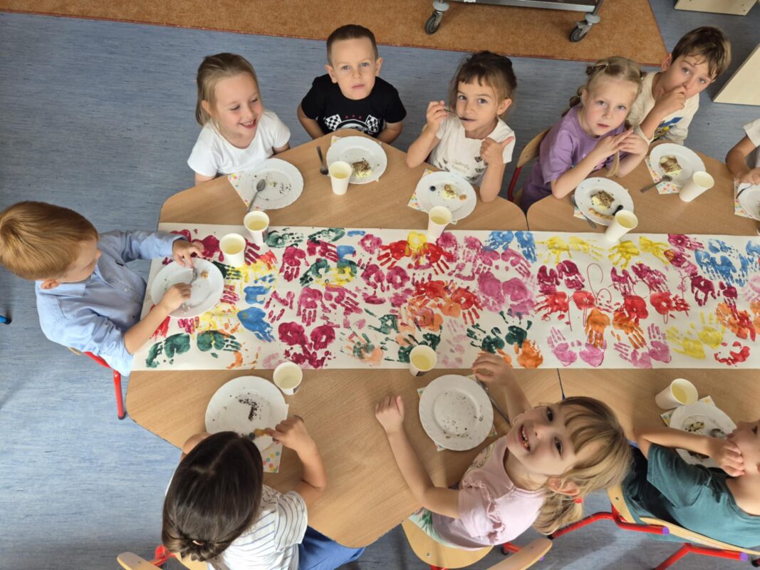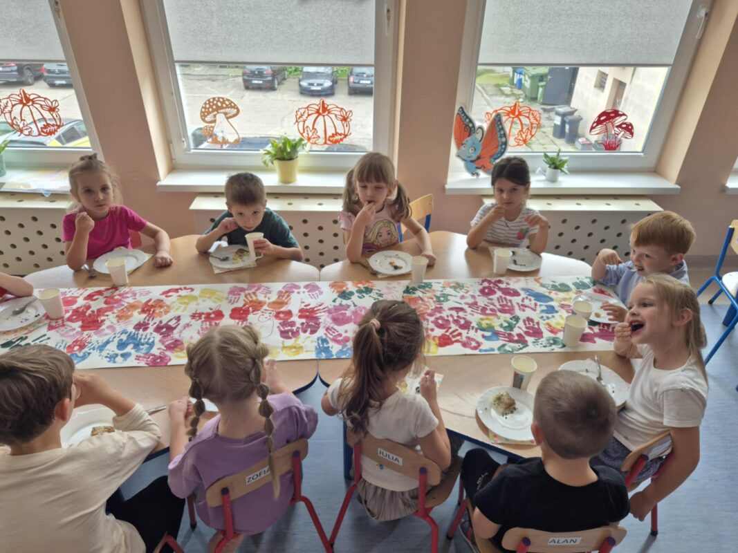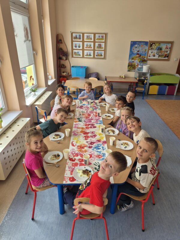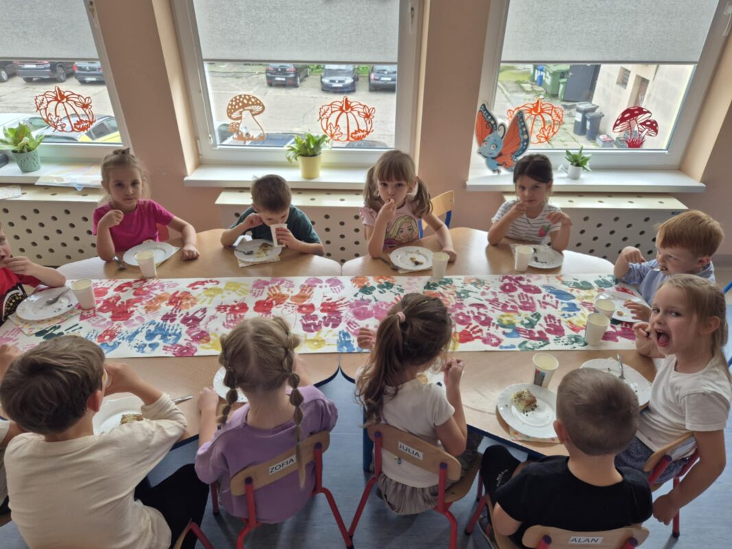 Po wspólnych zabawach i tańcach przyszedł czas na wręczenie w sali emblematów z motywem motyla oraz słodki, pyszny deser na podwieczorek. Aby stół wyglądał pięknie i wyjątkowo, dzieci samodzielnie przyozdobiły bieżnik.