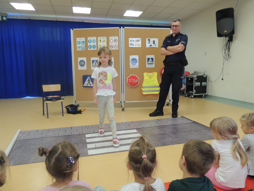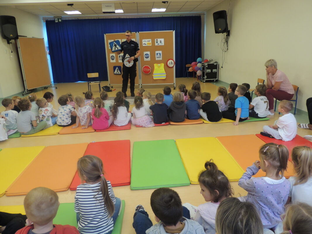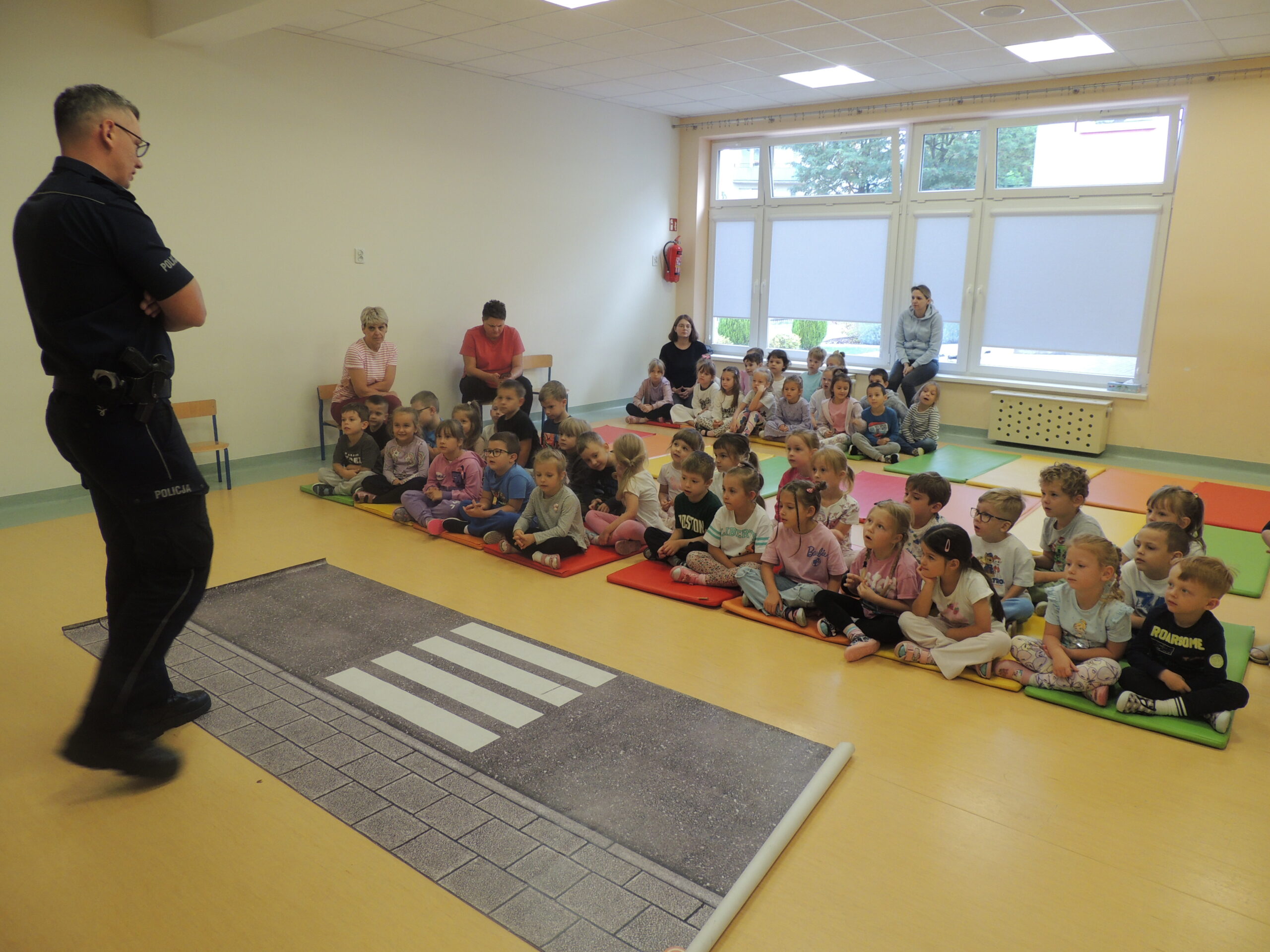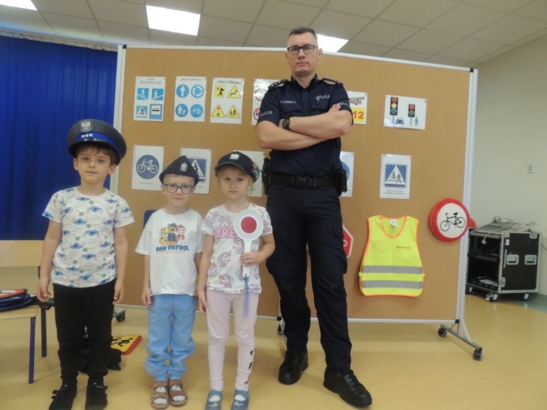 We wtorek 29 września nasze przedszkole odwiedził pan policjant z pobliskiego komisariatu policji. Celem wizyty była rozmowa i przypomnienie zasad obowiązujących na drodze. Dzieci chętnie brały udział w spotkaniu, wykazały się dużą wiedzą o bezpieczeństwie – odpowiadały na pytania, demonstrowały prawidłowy schemat przejścia przez jezdnię. Na koniec spotkania entuzjastycznie i dumnie przymierzały czapki policyjne.