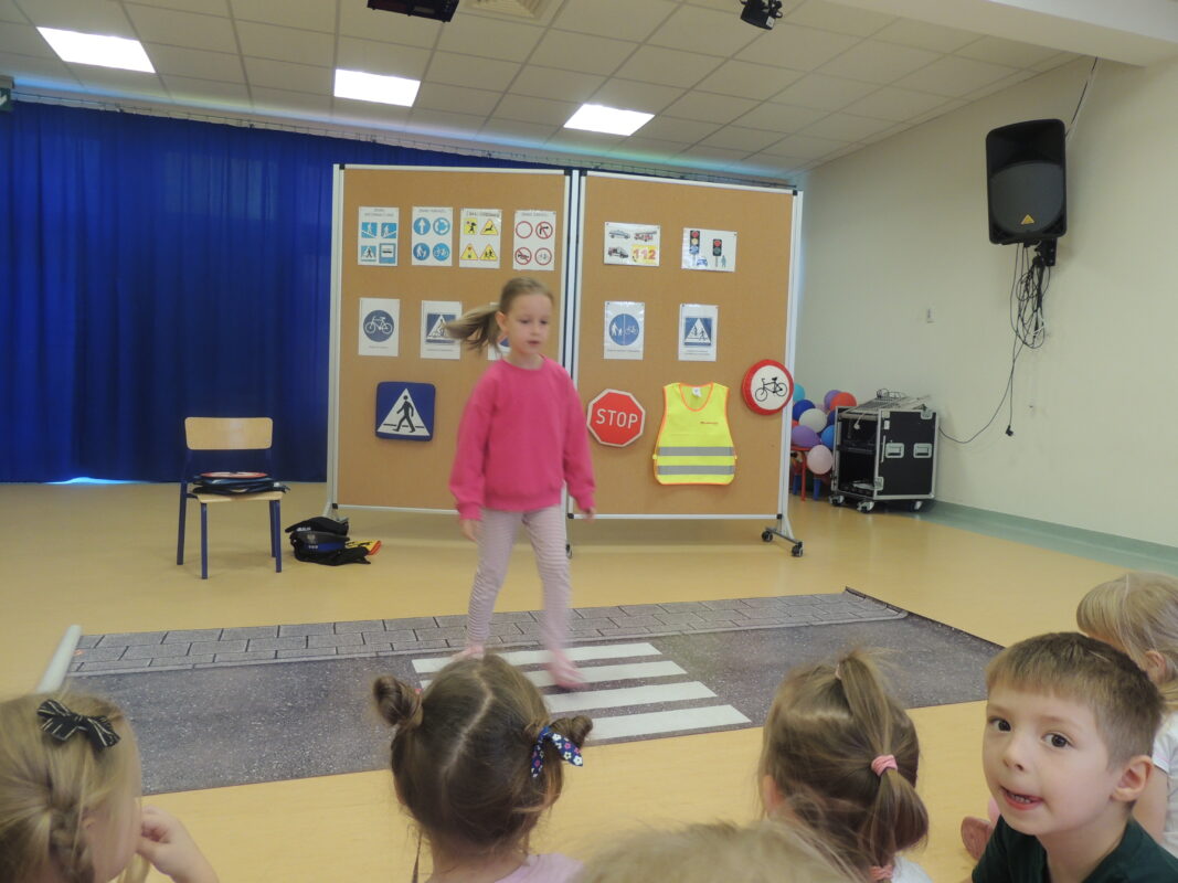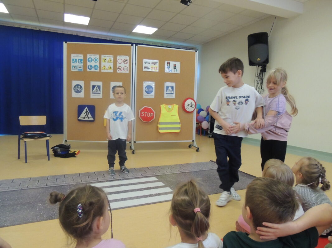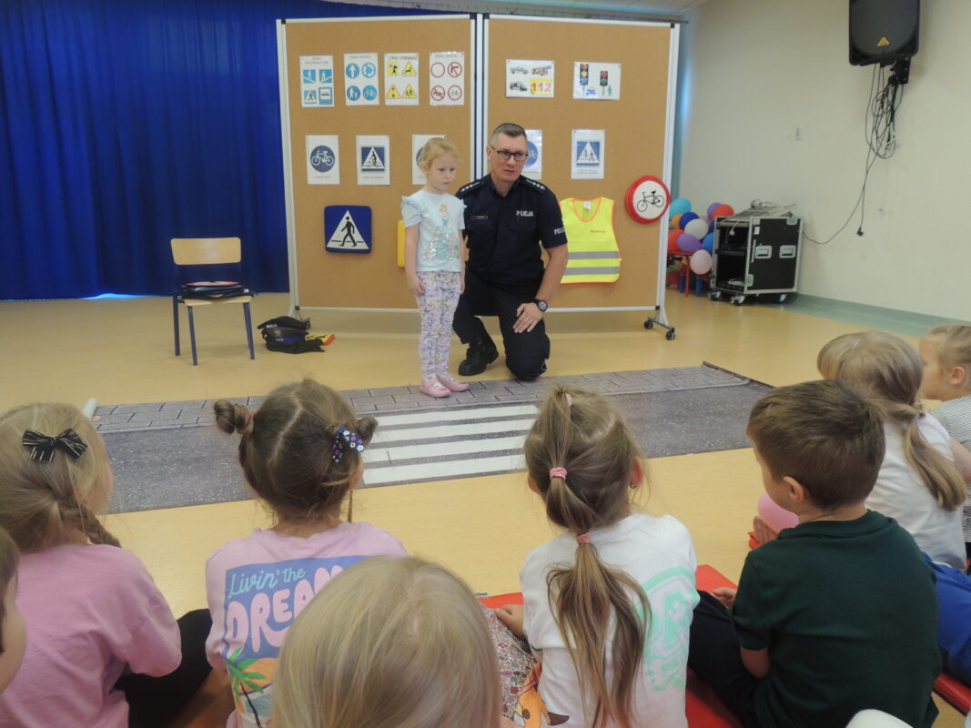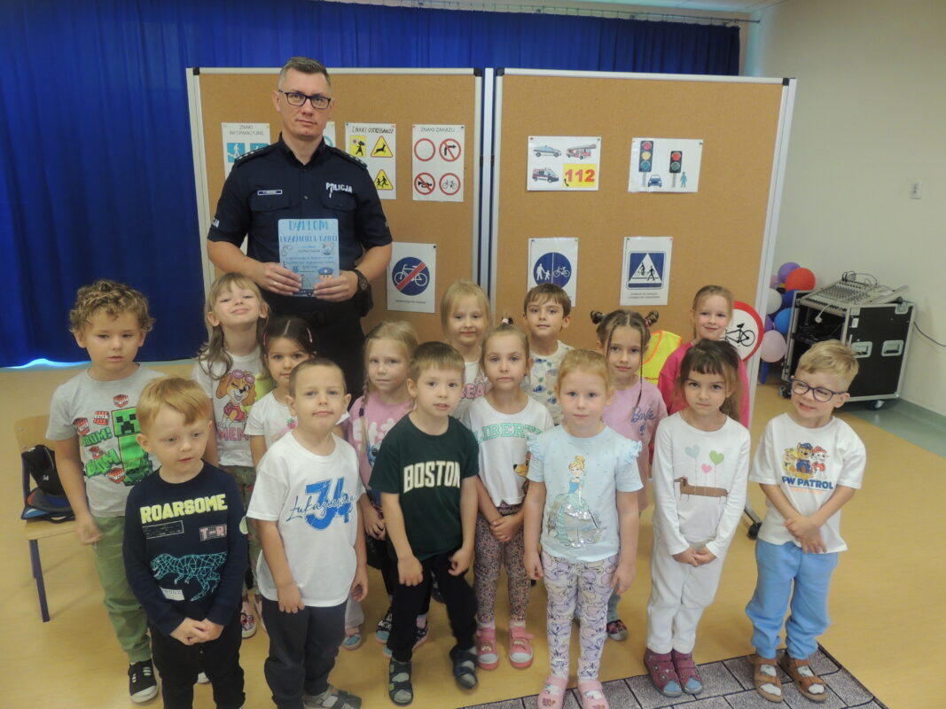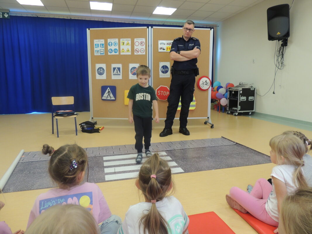 We wtorek 29 września nasze przedszkole odwiedził pan policjant z pobliskiego komisariatu policji. Celem wizyty była rozmowa i przypomnienie zasad obowiązujących na drodze. Dzieci chętnie brały udział w spotkaniu, wykazały się dużą wiedzą o bezpieczeństwie – odpowiadały na pytania, demonstrowały prawidłowy schemat przejścia przez jezdnię. Na koniec spotkania entuzjastycznie i dumnie przymierzały czapki policyjne.