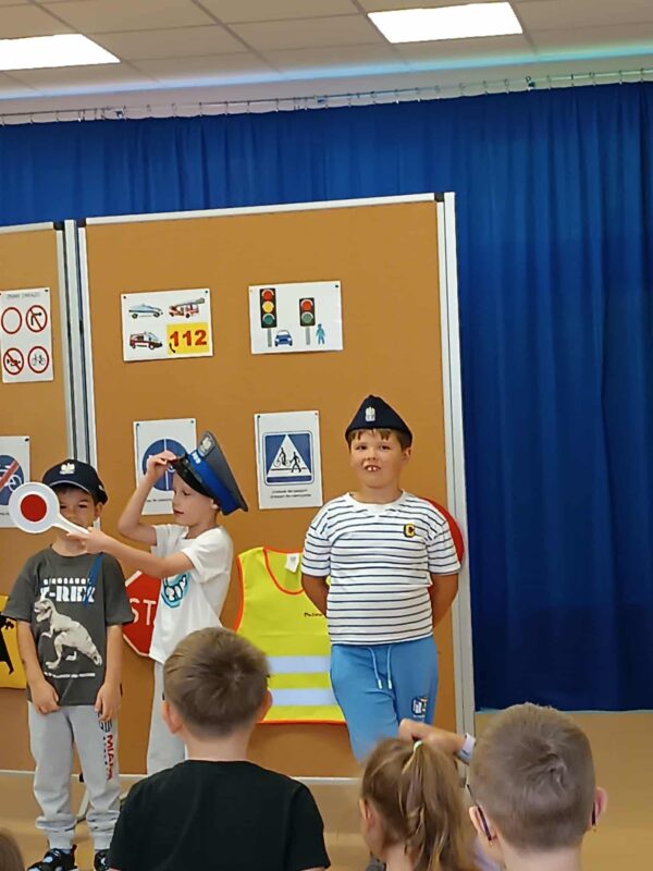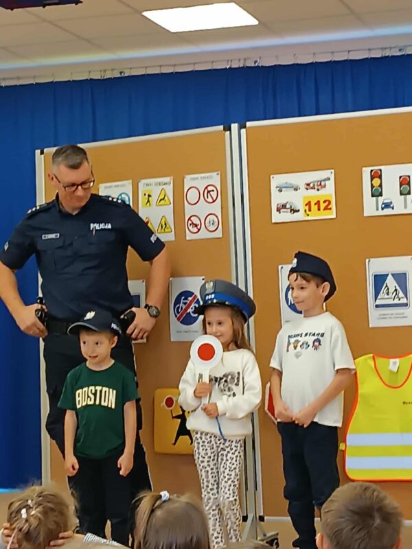 29.09.2025r. nasze przedszkole odwiedził pan Policjant. Dzieci zadawały mnóstwo pytań dotyczących pracy Policjanta. Dzieci przypomniały sobie jak należy prawidłowo zachowywać podczas przechodzenia przez pasy. Pan policjant przypomniał dzieciom o podstawowych znakach drogowych. Dzieci miały możliwość założyć czapkę policjanta i potrzymać lizak policyjny.